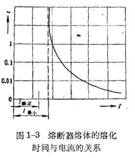 熔断器的熔体从固态转到液态直至汽化的过程通常叫做熔化过程,熔化过程的时间与电流的大小有关。电流愈大,熔化时间愈短。图1-3所示为熔断器熔体的熔化时间和电流的关系曲线。当电流逐渐减小到某一数值时,熔化时间就趋近于无穷大,达到这一数值的电流我们称做最小熔化电流I最小。