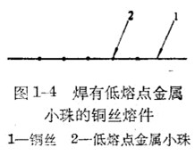若采用铜或银做熔体,由于电阻率小,可以做成小截面的熔体,但它们的烙化点比较高(1080℃和960℃),对于这种熔体降低熔化点的有效措施是利用冶金效应,即在铜和银制成的熔丝上焊上低熔点的金属小珠(如用铅或锡,实脸证明采用锡比铅效果好),如图1-4所示。当铜丝(或银丝)上的溢度稍大于低熔点的金属小珠温度时,此金属小珠即熔化,使焊接小珠部分的铜丝(或银丝)也逐渐熔化,造成很多断点,并产生电弧;当电弧燃烧到一定长度不足以维持电弧继续燃烧时,电弧熄灭,电路断开。此外,尚有其他一些降低熔休熔化温度的方法,例如采取分段用锡等措施。