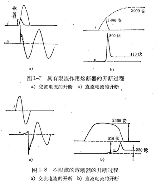 熔断器按照开断电流的性质可以分为限流和不限流的两种:所谓限流的熔断器是指当短路电流还未达到最大值Im时,已完成汽化、击穿、间隙产生电弧和熄灭电弧的过程,并将电流2突然下降到零(图1-7a为交流电流的开断情况,b为直流电流的开断情况);所谓不限流的熔断器是指电路中的电流将从落继续上升,’如图1-8中的悄况。在直流时,当电流达到接近短路电流的稳定状态后,待电弧拉长到不足以维持时才熄灭。在交流时,短路电流将持续到第一次电流过零瞬间媳灭电弧。有时短路电流还可能继续延到经过第二或第三次,电流过零瞬间才熄灭电弧。